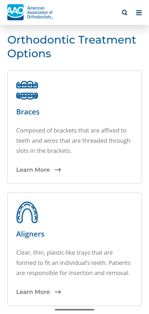 アメリカ矯正歯科学会のサイト▶では、Aligners(インビザラインを含むマウスピース矯正)は、Braces(ワイヤー矯正)と仲良く一緒に並んでいます。