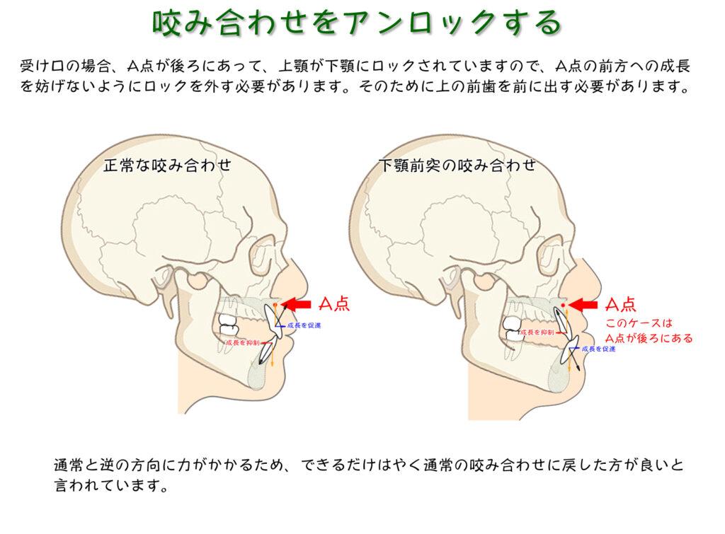 前期矯正を行っても、中学生でまた受け口になることがあります。これは矯正の後戻りではなく、下顎の成長が原因です。身長の伸びを止めることができないのと同じで、下顎の成長を止めることはできません。