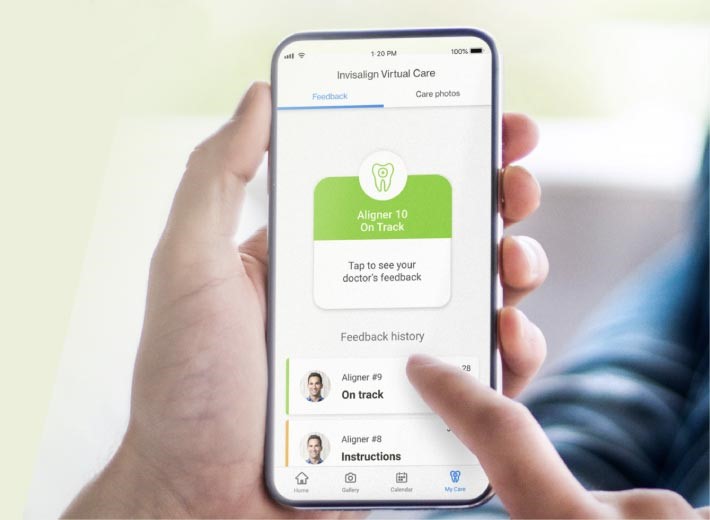 通常の矯正治療では、月に1回歯科医院に通院して、歯の動きが計画通りかチェックしてもらう必要があります。しかし、「マイインビザラインアプリ」を使えば、オンラインで歯科医師の診察をうけていただくことができます。